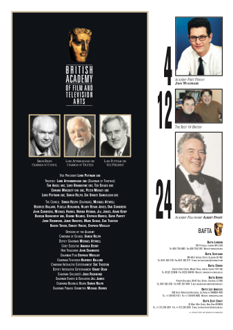 HON TREASURER JOHN CHAMBERS CHAIRMAN FILM STEPHEN WOOLLEY CHAIRMAN TELEVISION BEATRICE BALLARD CHAIRMAN INTERACTIVE ENTERTAINMENT SUE THEXTON DEPUTY INTERACTIVE ENTERTAINMENT GRANT DEAN CHAIRMAN CHILDREN’S JOHN RICHMOND CHAIRMAN EVENTS & EDUCATION JILL JAMES CHAIRMAN BUSINESS BOARD SIMON RELPH CHAIRMAN FINANCE COMMITTEE MICHAEL HARRIS