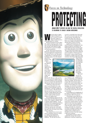 “Downloading a feature film like Toy Story 2 from those disks takes about ten hours” he explains, “so at the moment it’s not practical to do it on a wide distri- bution basis. Until that delivery system is refined we don’t know how it’s going to affect us in terms of print distribution. Unless they find a quicker way of down- loading a hard disk onto a hard drive we’ll still be working in a tangible medi- um like film, but if they find a way of sending it down a telephone line or through the airwaves, then that medium is effectively eradicated.”