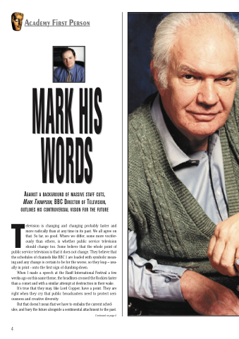AGAINST A BACKGROUND OF MASSIVE STAFF CUTS, MARK THOMPSON, BBC DIRECTOR OF TELEVISION, OUTLINES HIS CONTROVERSIAL VISION FOR THE FUTURE