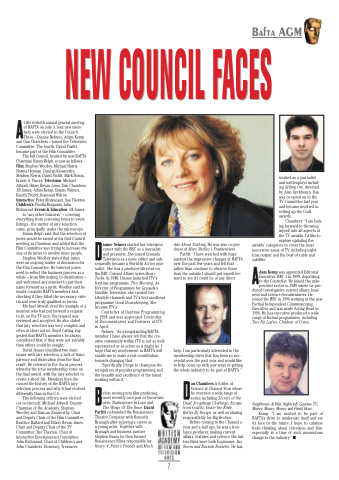 At the fortieth annual general meeting of BAFTA on July 3, four new mem- bers were elected to the Council. Three – Dianne Nelmes, Adam Kemp and Dan Chambers – joined the Television Committee. The fourth, David Parfitt, became part of the Film Committee.