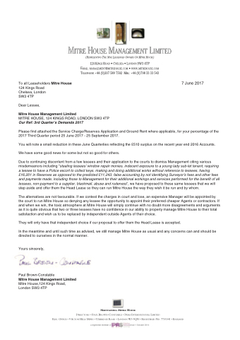 The alternatives are not favourable. If we contest the charges in court and lose, an expensive Manager will be appointed by the court to run Mitre House so denying any lessee the opportunity to appoint their preferred cheaper Agents or contractors. If and when we win, the toxic atmosphere at Mitre House will simply continue with no doubt more disagreements and arguments as it is quite obvious that two or three lessees have no confidence in our ability to properly manage Mitre House to their total satisfaction and wish us to be replaced by independent outside Agents of their choice.