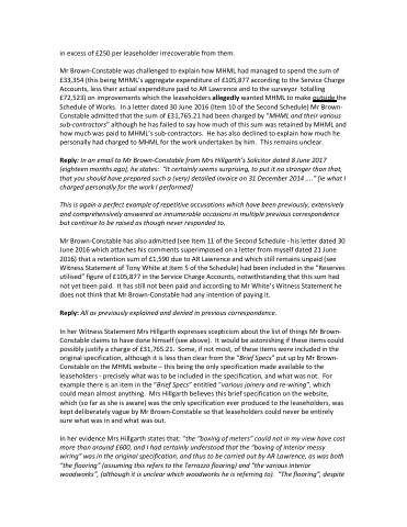 Mr Brown-Constable was challenged to explain how MHML had managed to spend the sum of £33,354 (this being MHML’s aggregate expenditure of £105,877 according to the Service Charge Accounts, less their actual expenditure paid to AR Lawrence and to the surveyor totalling £72,523) on improvements which the leaseholders allegedly wanted MHML to make outside the Schedule of Works. In a letter dated 30 June 2016 (Item 10 of the Second Schedule) Mr Brown- Constable admitted that the sum of £31,765.21 had been charged by “MHML and their various sub-contractors” although he has failed to say how much of this sum was retained by MHML and how much was paid to MHML’s sub-contractors. He has also declined to explain how much he personally had charged to MHML for the work undertaken by him. This remains unclear.