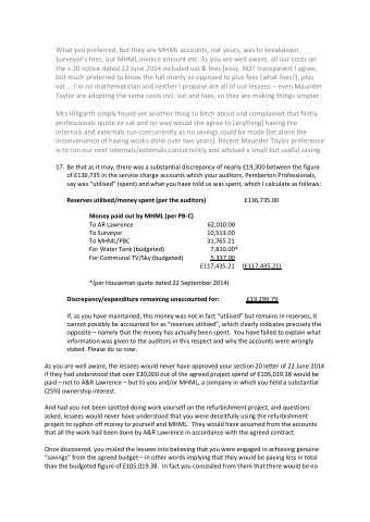 17. Be that as it may, there was a substantial discrepancy of nearly £19,300 between the figure of £136,735 in the service charge accounts which your auditors, Pemberton Professionals, say was “utilised” (spent) and what you have told us was spent, which I calculate as follows: