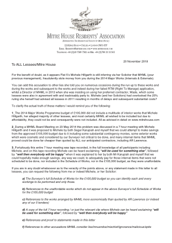 1_The 2014 Major Works Programme budget of £105,000 did not include a multitude of interior works that Michele Hillgarth, her alleged majority of other lessees, and most certainly MHML all wished to be included but due to affordability, they could not be and consequently were not included. All as advised in detail on www.mitrehouse.com