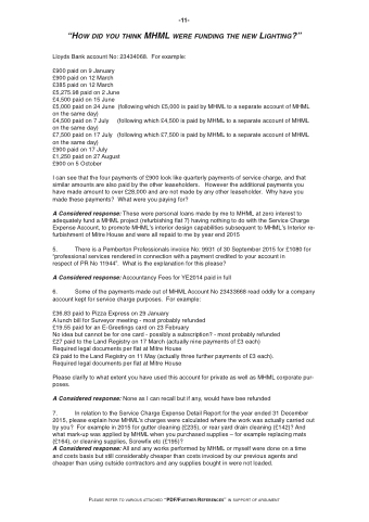 A Considered response: These were personal loans made by me to MHML at zero interest to adequately fund a MHML project (refurbishing flat 7) having nothing to do with the Service Charge Expense Account, to promote MHML’s interior design capabilities subsequent to MHML’s Interior re- furbishment of Mitre House and were all repaid to me by year end 2015