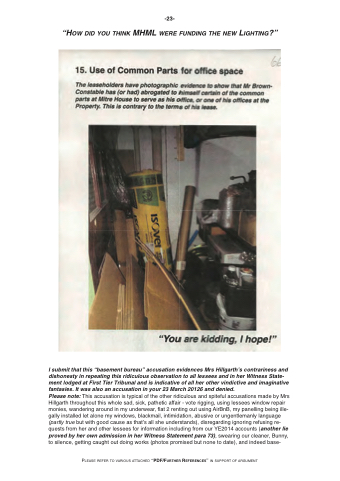 I submit that this “basement bureau” accusation evidences Mrs Hillgarth’s contrariness and dishonesty in repeating this ridiculous observation to all lessees and in her Witness State- ment lodged at First Tier Tribunal and is indicative of all her other vindictive and imaginative fantasies. It was also an accusation in your 23 March 20126 and denied.