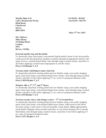 To chemically strip back existing polish and wax finishes using a non acidic stripping agent, deep clean using a concentrated liquid stone cleaner, rinse through using a neutral cleaner, and allow to dry before applying 2/3 no. coats of a prepared emulsion sealer. Price £ 3019.50 plus V.A.T