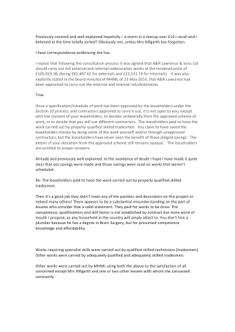 Other works were carried out by MHML using both the above to the satisfaction of all concerned except Mrs Hillgarth and one or two other lessees with whom she canvassed constantly.