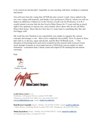 You will note from the voting that AFTER the nine owners' result, I have added in the (no vote) voting with majority, and finally Lisa's preferences (Flat 8), which you will see makes no difference whatsoever to the Owners overall vote for Preference A or B. I would remind everyone that she has lived at Mitre House for 15 years and has as much right to her opinions as anyone else, and certainly above those who do not call Mitre House their home. Those that live here have to come back to something they like and feel happy with.