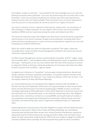 As I recall, blackmail was me insisting that Mrs Hillgarth should act like the MHML co- Director she was [until September 2014] and to set a good example to other lessees [with whom she had allied herself to the distinct disadvantage of MHML and her co-Directors including progressing an RTM application in 2013 which failed due to technical reasons she was well aware of, or should have been, or her Solicitors should have been. Mrs Hillgarth was obstructive, contentious and bent on causing MHML and myself maximum anxiety in our preparation and progressing of both general maintenance of Mitre House and more relevantly, the forthcoming major works’ programme scheduled finally for 1 September 2014.