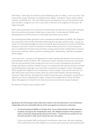 I can’t say more – she was in full agreement to make savings and spend on those items we all wanted but could not afford. And “anyway we could” included, and she was well aware, that not only would we make savings from non use of certain contingencies but also by doing anything we could far cheaper but just as competently than quoted and that included myself doing those workings I was more than competent to progress, which I did to good effect despite Mrs Hillgarth now considering it of poor quality – but you will recall her 1st April 2015 letter [some three months after the works had finished], with the following comment “Now that the refurbishment at Mitre House has been completed I would like to register my concern regarding the vulgar, cheap and unsuitable décor chosen by Mitre House Management Limited for the communal area (no comments required please).”