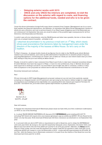 I hope the above information brings forth some direct comment from Lessees. Management can do no more than explain the financial implications. And Michele, do remember that Mitre House Management Limited of which you are a Director, are now in serious breach of our Head Lease obligations and if the Externals are not commenced 1st September this year, you must be aware of the possible legal consequences for all four Directors, both financially and fiduciary.