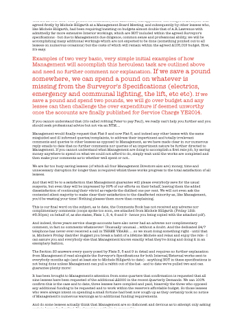 emergency and communal lighting, the lift, etc etc). If we save a pound and spend two pounds, we will go over budget and any lessee can then challenge the over expenditure if deemed unworthy once the accounts are finally published for Service Charge YE2014.