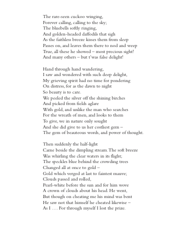The speckles blue behind the crowding trees Changed all at once to gold –
