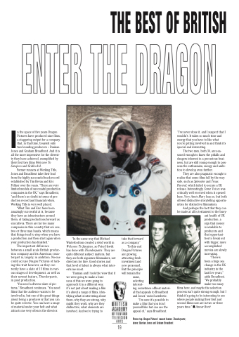 In the space of five years Dragon Pictures have produced nine films, a staggering output for a company that, in that time, boasted only two founding producers – Damian Jones and Graham Broadbent. And it is all the more impressive for the diversi- ty they have achieved, exemplified by their first two films Welcome To Sarajevo and Gridlock’d.