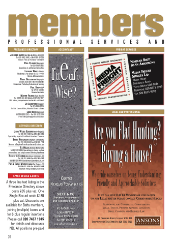 A three line text listing in the Freelance Directory above costs £35 plus vat. One Single Box ad costs £185 plus vat. Discounts are available for Bafta members, joining (multiple) boxes and for 6 plus regular insertions Please call 020 7437 1945 for details and discounts NB. All positions pre-paid