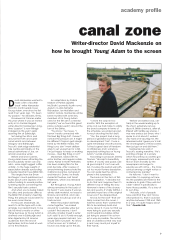 For his part, Mackenzie, 36, reacts to all the hype with a dis- armingly cool detachment. To be fair, his mind is mostly on other things because as Young Adam is chewed over in Edinburgh and later digested by UK cinema audiences from the end of September, he’ll be hard at work on his third feature.