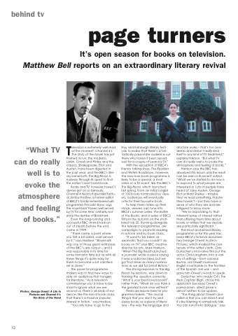 Television is extremely well read at the moment: Channel 4’s The Story of the Novel has just finished its run; the moderns, Larkin, Orwell and Pinter, and the classics, Shakespeare, Eliot and Austen, have been digested in the past year; and the BBC’s liter- ary behemoth, The Big Read, is midway through its quest to find the nation’s best loved book.