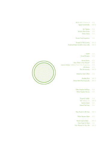 House Doctor (C5) How Clean Is Your House? (C4) Jamie’s Kitchen TalkBack/Fresh One Productions (C4) Life Doctor (C5)