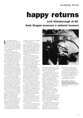 And while it is easy to lam- poon his generosity of spirit and the fact that his heart is seldom far from his sleeve, we should never forget that Attenborough is arguably our greatest living direc- tor. You can count the number of current British Best Director Oscar winners, literally, on the fingers of one hand and he is one of them. Not only that, for a great many years, Attenborough was the British film industry. There are young men and women who can now plan careers on either side of the camera instead of scratch- ing a living as previous genera- tions did and that is due to the efforts of Attenborough and a few determined but like-minded fellows. Those efforts are not just confined to his work with BAFTA.