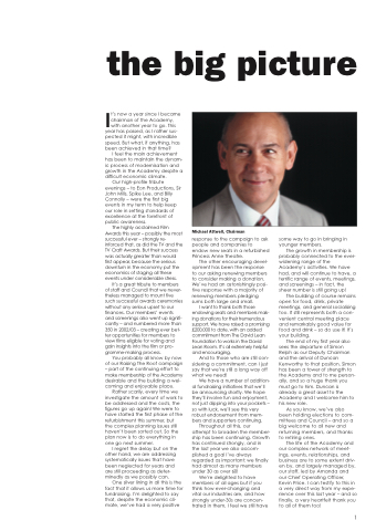 The end of my first year also sees the departure of Simon Relph as our Deputy Chairman and the arrival of Duncan Kenworthy to that position. Simon has been a tower of strength to the Academy and to me person- ally, and so a huge thank you must go to him. Duncan is already a great asset to the Academy and I welcome him to his new role.