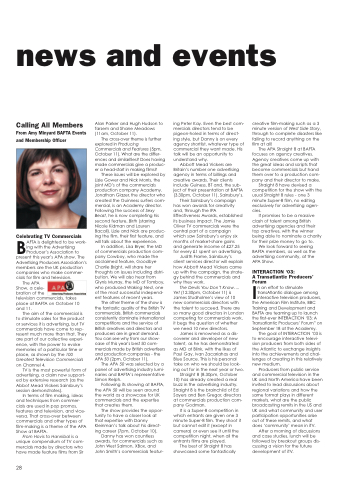 BAFTA is delighted to be work- ing with the Advertising Producer’s Association to present this year’s APA show. The Advertising Producers Association’s members are the UK production companies who make commer- cials for film and television.