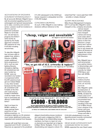Mrs Hillgarth’s spite- ful destruction of Mitre House since MHML donated the Head Lease at nil consideration is well documented here on these pages resulting in the inte- rior of Mitre House now a shadow of its former self more resembling Bleak House and after a