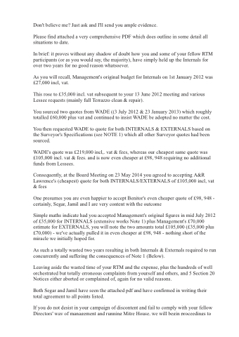 Leaving aside the wasted time of your RTM and the expense, plus the hundreds of well orchestrated but totally erroneous complaints from yourself and others, and 5 Section 20 Notices either aborted or complained of, again for no valid reasons.