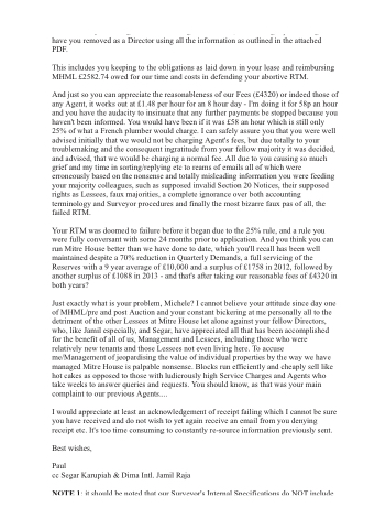 Just exactly what is your problem, Michele? I cannot believe your attitude since day one of MHML/pre and post Auction and your constant bickering at me personally all to the detriment of the other Lessees at Mitre House let alone against your fellow Directors, who, like Jamil especially, and Segar, have appreciated all that has been accomplished for the benefit of all of us, Management and Lessees, including those who were relatively new tenants and those Lessees not even living here. To accuse me/Management of jeopardising the value of individual properties by the way we have managed Mitre House is palpable nonsense. Blocks run efficiently and cheaply sell like hot cakes as opposed to those with ludicrously high Service Charges and Agents who take weeks to answer queries and requests. You should know, as that was your main complaint to our previous Agents....