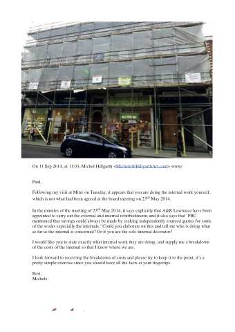 In the minutes of the meeting of 23rd May 2014, it says explicitly that A&R Lawrence have been appointed to carry out the external and internal refurbishments and it also says that ‘PBC mentioned that savings could always be made by seeking independently sourced quotes for some of the works especially the internals.’ Could you elaborate on this and tell me who is doing what as far as the internal is concerned? Or if you are the solo internal decorator?