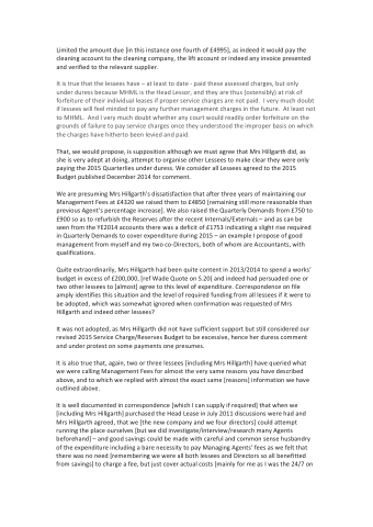 That, we would propose, is supposition although we must agree that Mrs Hillgarth did, as she is very adept at doing, attempt to organise other Lessees to make clear they were only paying the 2015 Quarterlies under duress. We consider all Lessees agreed to the 2015 Budget published December 2014 for comment.