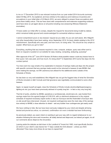 to me on 17 December 2015 to see relevant invoices from our year ended 2014 Accounts summary dated 30 May 2015. As explained, and due entirely to the salacious and malicious innuendos and accusations in your initial letter of 23 March 2016, we were obliged to answer those accusations and prove them totally untrue. This we have done with comprehensive and extensive supporting evidence (and have done so yet again above on all points including now answering Witness Statement anomalies).