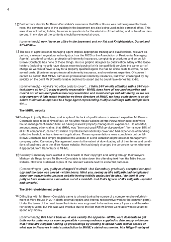 13The role of a professional managing agent implies appropriate training and qualifications, relevant ex- pertise, a relevant regulatory authority (such as the RICS or the Association of Residential Managing Agents), a code of conduct, professional indemnity insurance, complaints procedures and so on. Mr Brown-Constable has none of these things. He is a graphic designer by qualification. Many of the lease- holders (including myself) have always resented paying for his (unqualified) services the same sort of charge as we would have to pay for a properly qualified agent. He has no office costs to cover, no per- sonnel costs, (I believe) no professional indemnity insurance, and no relevant expertise. Of course I cannot be certain that MHML carries no professional indemnity insurance, but when challenged by my solicitor on the point Mr BrownConstable declined to assert (as he could have done) that it did.