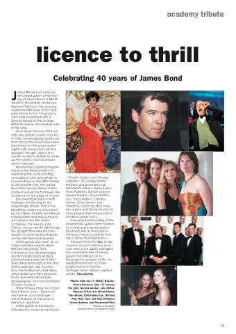 James Bonds past and pres- ent joined guests at the film- ing of James Bond: A BAFTA Tribute in November. Hosted by Michael Parkinson, the evening celebrated 40 years of 007 and paid tribute to Eon Productions, who were presented with a Special Award at The Orange British Academy Film Awards earli- er this year.