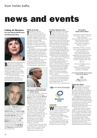 Moving into the third year, these highly popular events allow BAFTA members working at all levels of the film, television, and interactive industries to make important con- tacts, share ideas, and meet others working in similar areas.