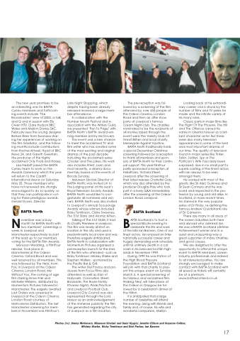 Maureen Sinclair, Director of BAFTA North, was invited on to the judging panel at this year’s Royal Television Society Awards. BAFTA North would like to con- gratulate all nominees and win- ners. BAFTA North was also invited to Liverpool’s annual Scousology Awards whose winners included Ricky Tomlinson, Claire Sweeney, The 51st State and Atomic Kitten.