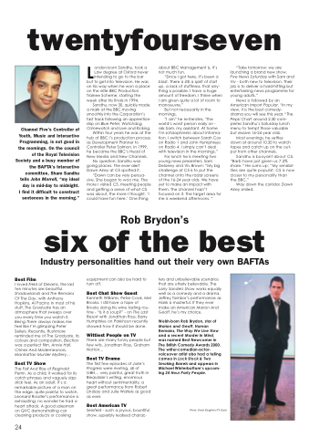 Welsh-born Rob Brydon, star of Marion and Geoff, Human Remains, The Way We Live Now and a recent Murder In Mind, was named Best Newcomer in The British Comedy Awards 2000. The writer-comedian-actor- voiceover artist also had a telling cameo in Lock Stock & Two Smoking Barrels and appears in Michael Winterbottom’s upcom- ing 24 Hour Party People.