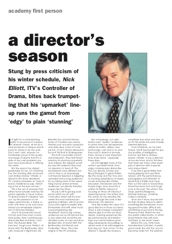 Stung by press criticism of his winter schedule, Nick Elliott, ITV’s Controller of Drama, bites back trumpet- ing that his ‘upmarket’ line- up runs the gamut from ‘edgy’ to plain ‘stunning’