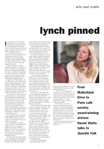 When she’s not juggling fea- ture film demands, Watts’ thoughts turn to a very personal piece of movie business. With a friend, and sometime co-star, Scott Coffey, she made a short film called Ellie Parker, in which she also stars as an actress - “not my life story but some elements of it.” After being successful shown at Sundance, there are now plans for it to be expanded into full-length film.