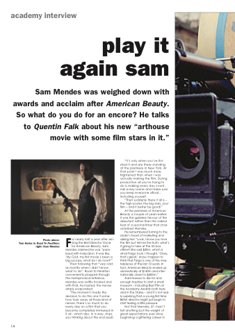 For nearly half a year after win- ning the Best Director Oscar for American Beauty, Sam Mendes claimed he was “para- lysed with indecision. It was like, ‘My God, my first movie’s been a big success, what do I do now?’”
