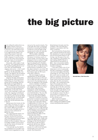 We have received tremendous support for the Film Awards from the industry on this side of the ‘pond’ and meetings to date indi- cate their ongoing commitment to the event. Thanks too to Peter Van den bussche and Andy Ward for making the trip, for their belief in the Film Awards and for their work with the Broadcasters here in the US.