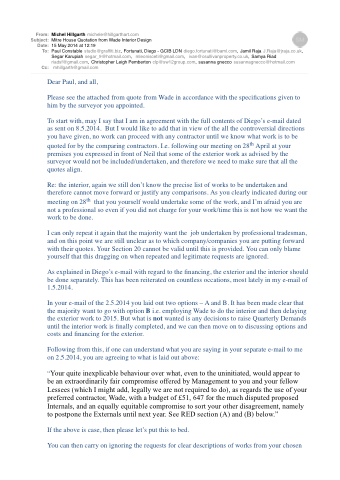 “Your quite inexplicable behaviour over what, even to the uninitiated, would appear to be an extraordinarily fair compromise offered by Management to you and your fellow Lessees (which I might add, legally we are not required to do), as regards the use of your preferred contractor, Wade, with a budget of £51, 647 for the much disputed proposed Internals, and an equally equitable compromise to sort your other disagreement, namely to postpone the Externals until next year. See RED section (A) and (B) below.”