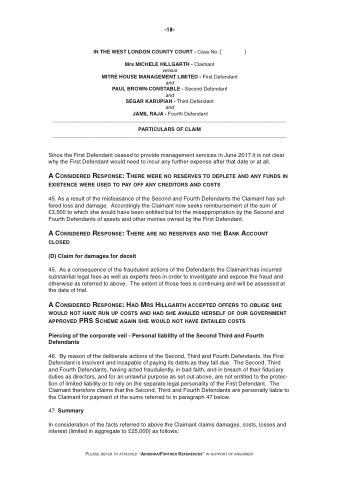 45. as a result of the misfeasance of the Second and Fourth Defendants the Claimant has suf- fered loss and damage. accordingly the Claimant now seeks reimbursement of the sum of £3,500 to which she would have been entitled but for the misappropriation by the Second and Fourth Defendants of assets and other monies owned by the First Defendant.