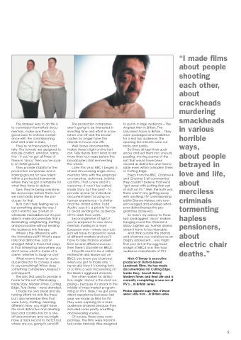 Execs from the BBC, Channel 4 and Channel 5 all commented they couldn’t believe that we’d “got away with putting that sort of stuff on ITV.” Well, the truth was there wasn’t any getting away with anything: ITV commissioning editor Dianne Nelmes only ever encouraged and enabled what- ever distinctiveness the pro- grammes achieved.