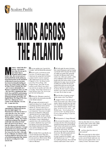 Miramax – named after their parents – was founded more than 20 years ago by New Yorker Harvey Weinstein and his younger brother, Bob. After several years as a hustling distributor mostly picking up independent product on the internation- al film festival circuit, the streetwise boys turned archetypally hustling pro- ducers. One of their earliest credits was on Palace Picture’s Scandal. Since then – and even more substantially since Miramax’s acquisition by Disney in 1994 – they have had a continuing and often fertile Oscar and BAFTA award-winning association with British filmmakers and UK-based production: Restoration, The English Patient, The Wings Of The Dove, Little Voice, Shakespeare In Love, Captain Corelli’s Mandolin, Chocolat, Iris... to name but a few.