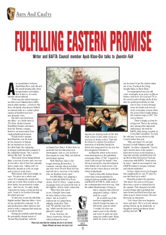 “Why am I there? It’s not just because I’m half Pakistani and half English,” he states, adamantly. “I’m try- ing to involve more of the people I know who’ve been in the business a long time and who probably have felt up till now that they haven’t had any connection with BAFTA.” Fresh talent, he avers, “must be encouraged to join if BAFTA wishes to remain a relevant and vibrant institution.”