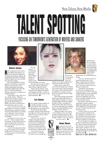Rebecca Johnson feels she owes a lot to BAFTA. Due largely to con- nections within the organisation, investment and members’ support, she completed her short film That Sinking Feeling last March and is now develop- ing a self-penned feature.