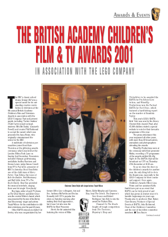 The BBC’s classic school drama Grange Hill won a special award for its out- standing creative contri- bution to television at the 6th annual British Academy Children’s Film and Television Awards in association with the LEGO Company. Past and present pupils, including ‘Tucker Jenkins’ (Todd Carty) joined ex-head- mistress ‘Mrs McClusky’ (Gwyneth Powell) and creator Phil Redmond to accept the award, which was presented by Anna Home, who originally commissioned the series for the BBC.
