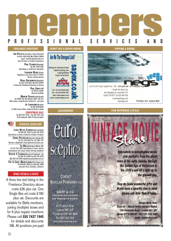 A three line text listing in the Freelance Directory above costs £35 plus vat. One Single Box ad costs £185 plus vat. Discounts are available for Bafta members, joining (multiple) boxes and for 6 plus regular insertions Please call 020 7437 1945 for details and discounts NB. All positions pre-paid