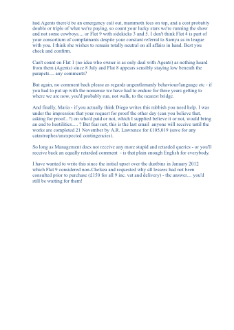 And finally, Maria - if you actually think Diego writes this rubbish you need help. I was under the impression that your request for proof the other day (can you believe that, asking for proof...?) on who'd paid or not, which I supplied believe it or not, would bring an end to hostilities..... ? But fear not, this is the last email anyone will receive until the works are completed 21 November by A.R. Lawrence for £105,019 (save for any catastrophes/unexpected contingencies).